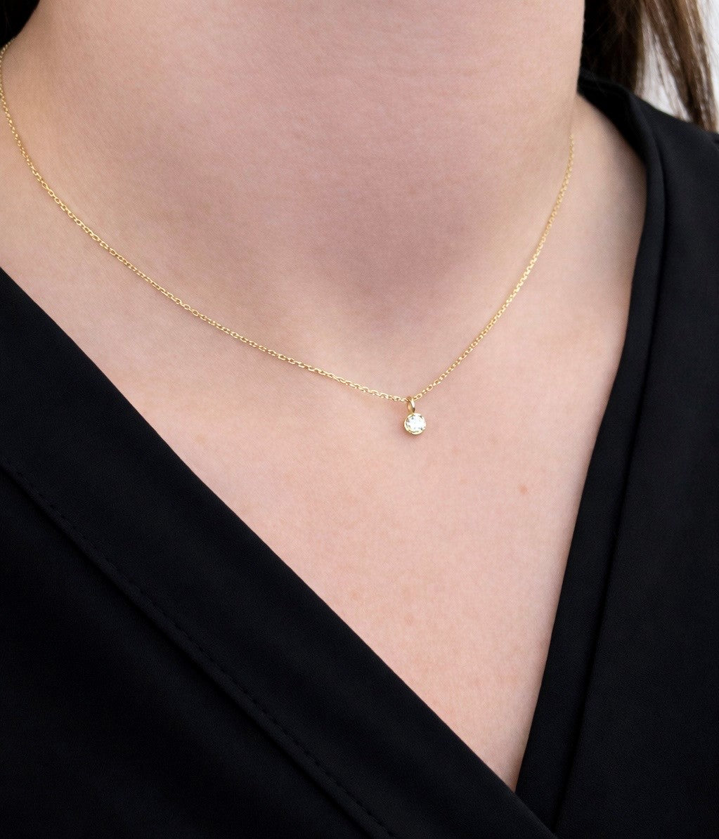 Vår Diamond Pendant i 18 karat guld har en briljantslipad WVS-diamant i storleken 0,10 ct. Diamanten är infattad i en gallery rail med fyra nätta klor. En design som låter stenens lyster komma till sin fulla rätt, formgiven