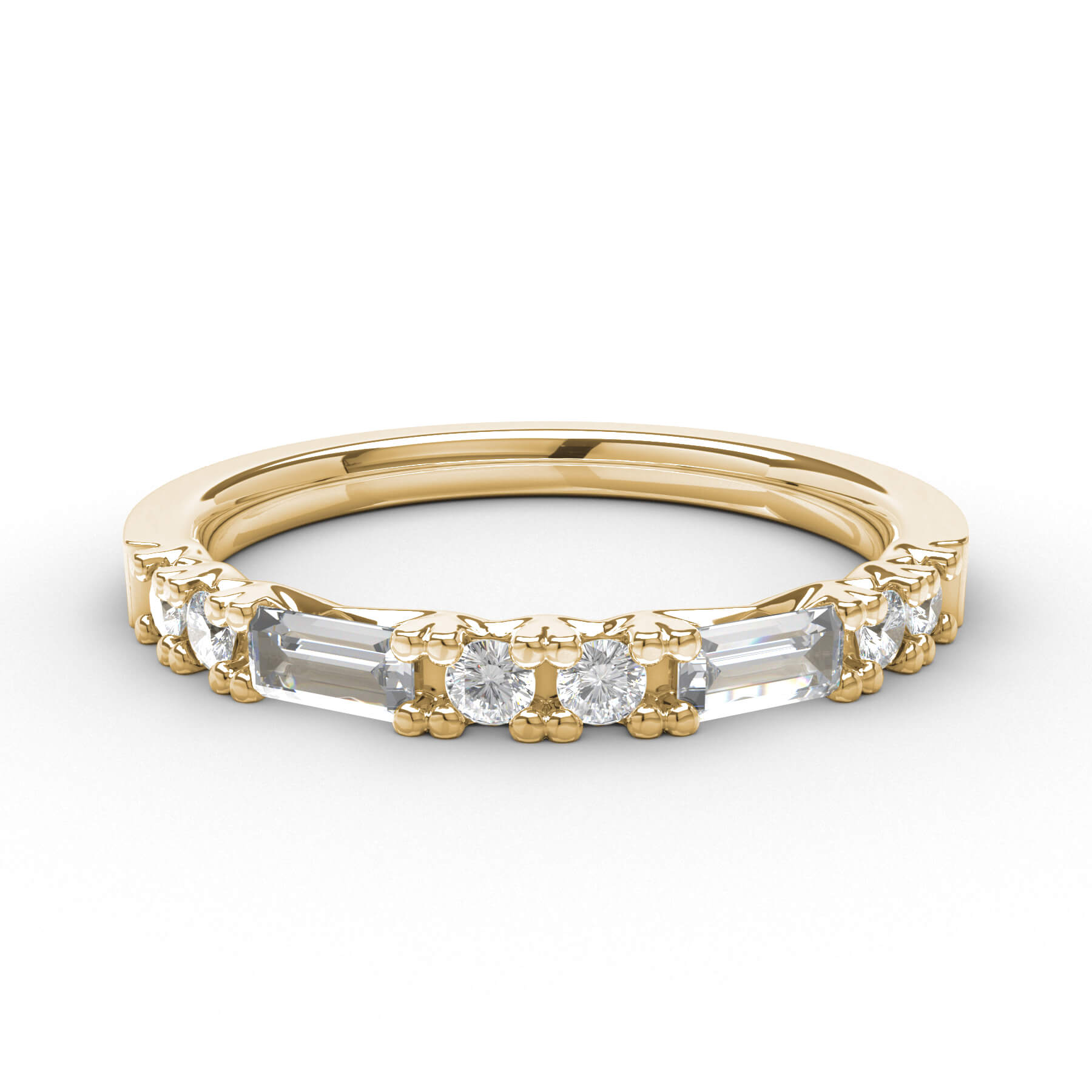 De tvÄ elegant baugetteslipade diamanterna pÄ 0,10 carat vardera omfamnas pÄ var sida av tvÄ briljantslipade diamanter, alla med TWVS-kvalité. Tillsammans bildar de totalt 0,38 carat. Tack vare diamanternas olika form och infattning, bildar de tillsammans en helhet av trendriktig design och speglar Àven en evig tidlöshet som gör ringen helt enastÄende.