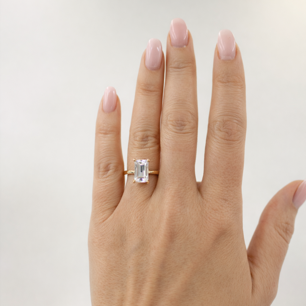 North Emerald cut är en förlovningsring med smaragdslipad lab grown diamant som kombinerar raka linjer med ett stilrent och sofistikerat uttryck. Den stora fasetten framhäver klarhet och kvalitet, och ringen passar lika bra som vigselring, solitärring, eller när du vill unna dig något elegant för dig själv.