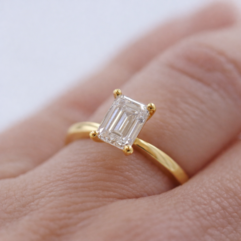 North Emerald cut är en förlovningsring med smaragdslipad lab grown diamant som kombinerar raka linjer med ett stilrent och sofistikerat uttryck. Den stora fasetten framhäver klarhet och kvalitet, och ringen passar lika bra som vigselring, solitärring, eller när du vill unna dig något elegant för dig själv.