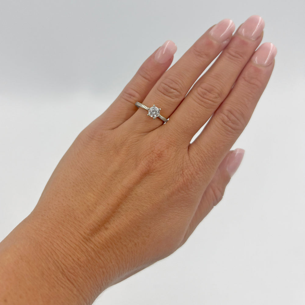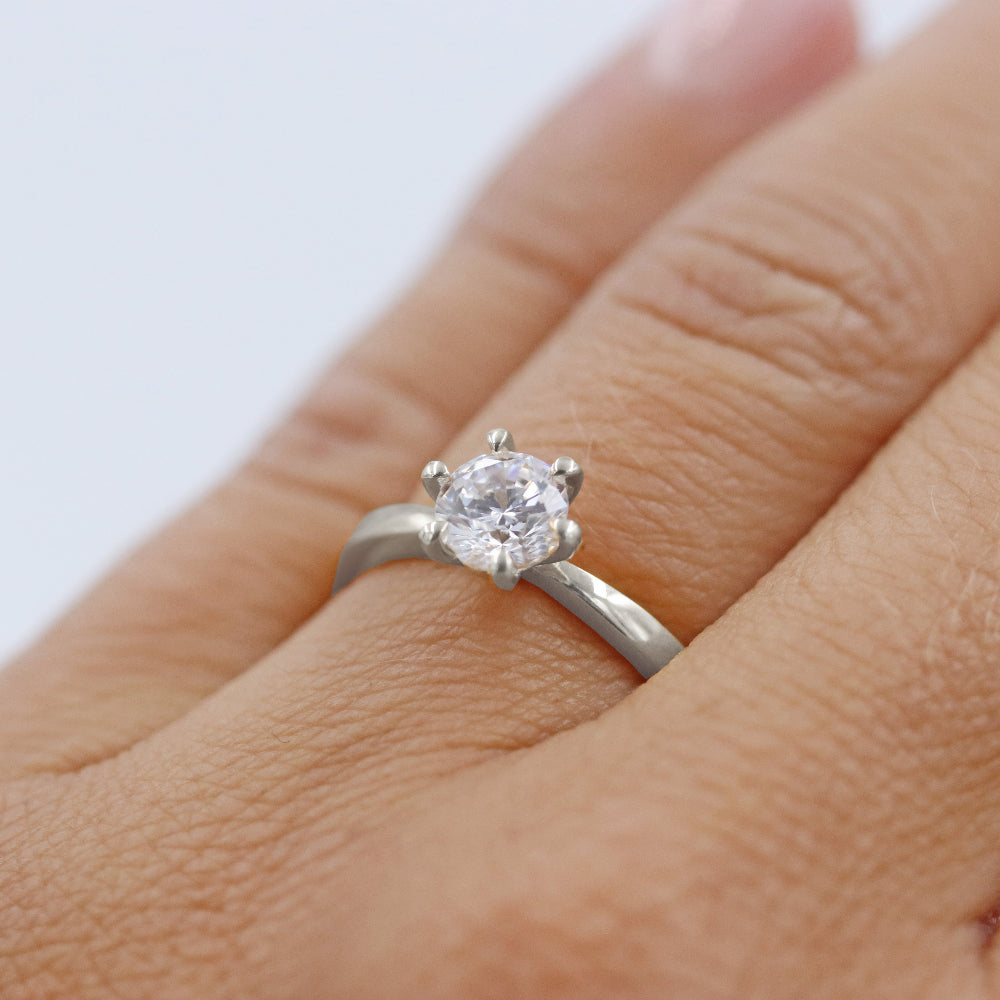 Med sin centrala plats strålar en lab-grown diamant på 0.70 carat. Ringen är 2 mm bred och utformad med en elegant midja där en sober fattning med sina sex klor håller den stora diamanten säkert på plats utan att ta ifrån dess skimrande briljans.