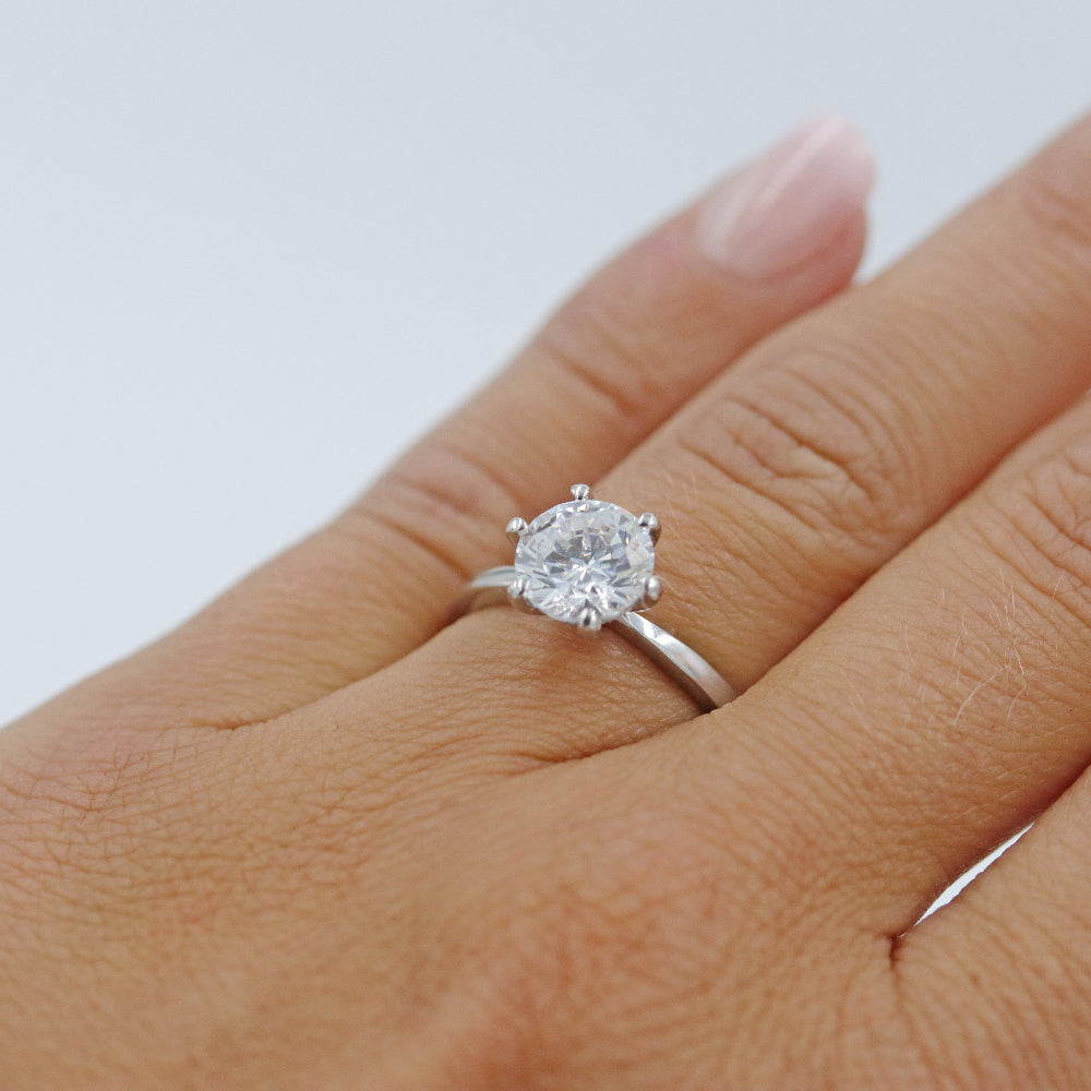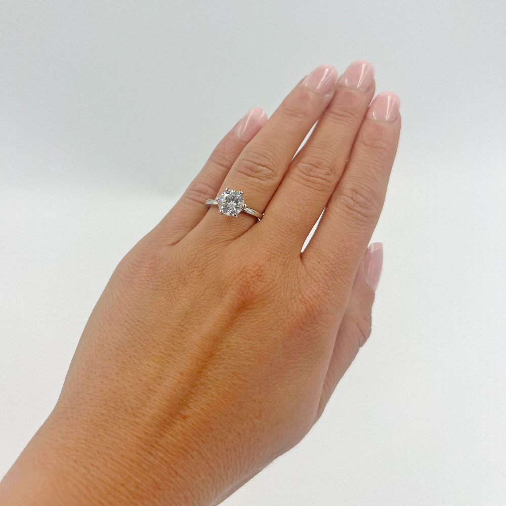 En 2,0 carats lab grown diamant ger denna solitärring en närmast majestätisk utstrålning. Diamanten är briljantslipad för att framhäva dess fulla prakt – en slipning som gör att varje fasett fångar och reflekterar ljuset på ett gnistrande sätt. Ringens skena är 2mm bred och har en vacker midja, välvd insida för optimal komfort.