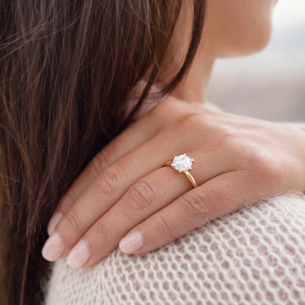 En 2,0 carats lab grown diamant ger denna solitärring en närmast majestätisk utstrålning. Diamanten är briljantslipad för att framhäva dess fulla prakt – en slipning som gör att varje fasett fångar och reflekterar ljuset på ett gnistrande sätt. Ringens skena är 2mm bred och har en vacker midja, välvd insida för optimal komfort.