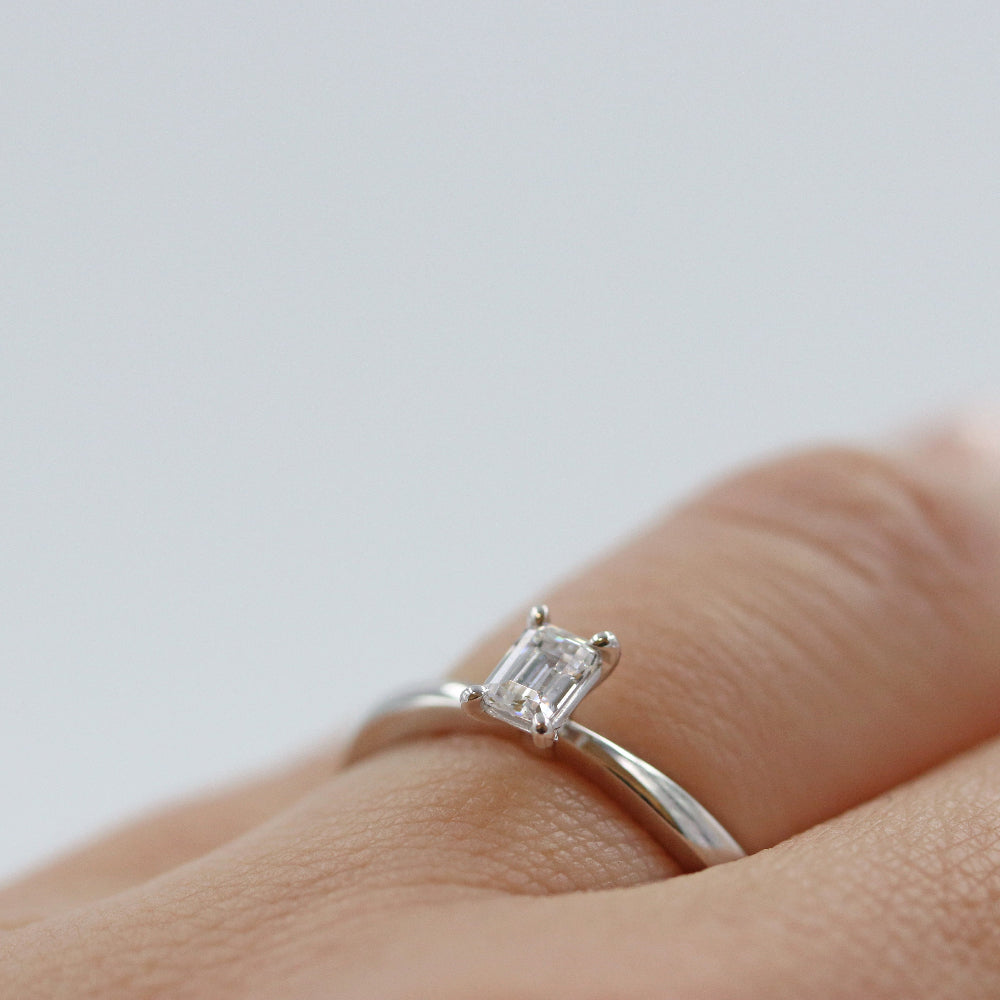 North Emerald cut är en förlovningsring med smaragdslipad lab grown diamant som kombinerar raka linjer med ett stilrent och sofistikerat uttryck. Den stora fasetten framhäver klarhet och kvalitet, och ringen passar lika bra som vigselring, solitärring, eller när du vill unna dig något elegant för dig själv.