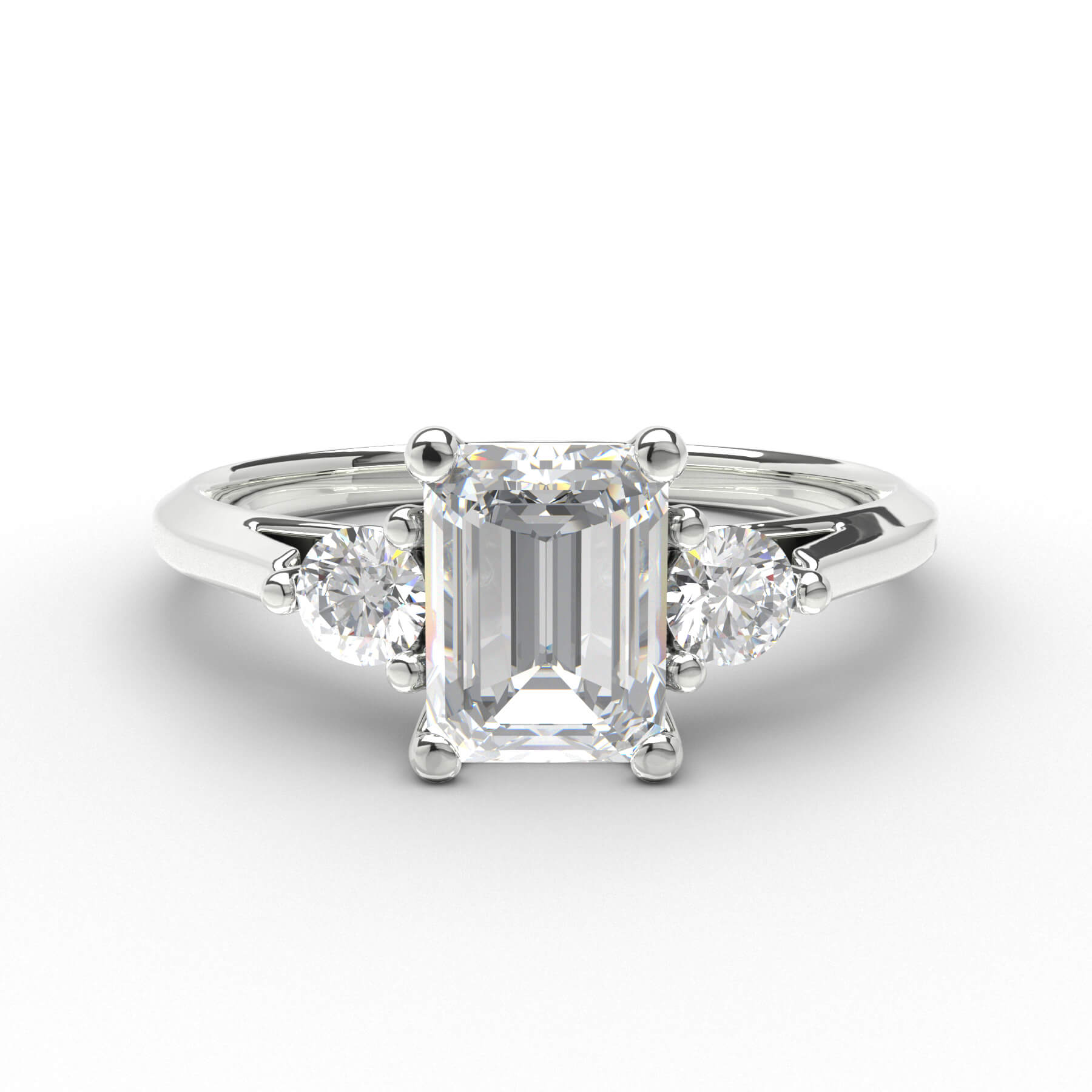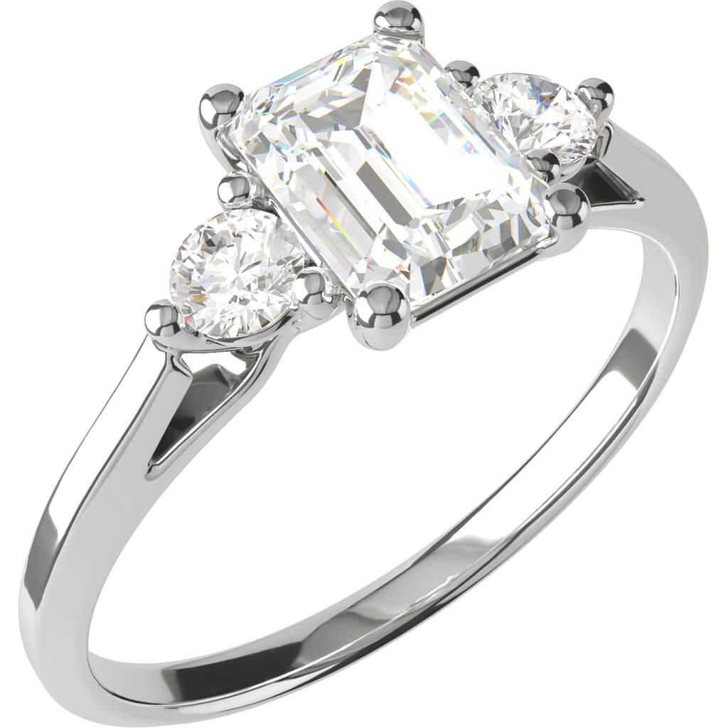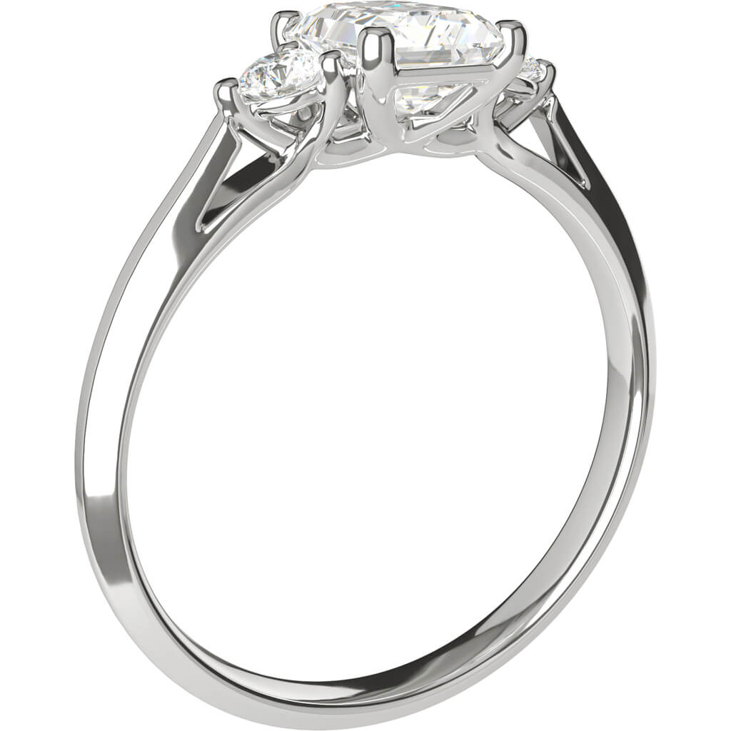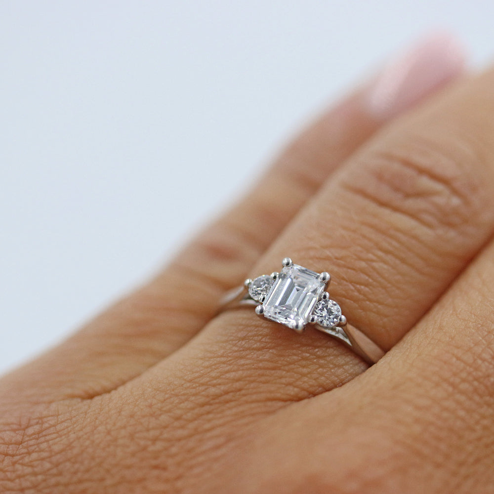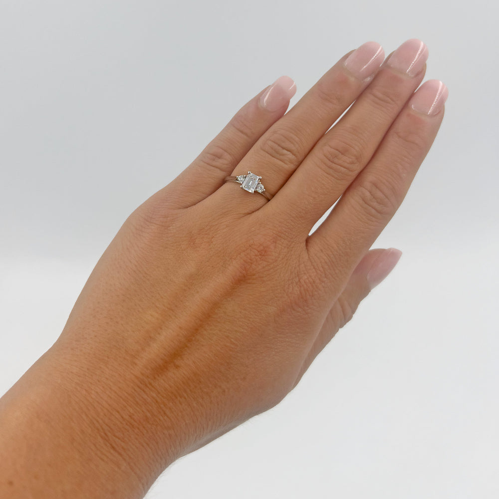 I centrum av Eterna 24 glittrar en 0,70 carats smaragdslipad diamant, omgiven av två briljantslipade sidostenar på 0,07 ct vardera, vilket ger en total carat på 0,84 ct. Ringen har en nätt skena på 2 mm med välvd insida, vilket gör den både elegant och bekväm att bära.