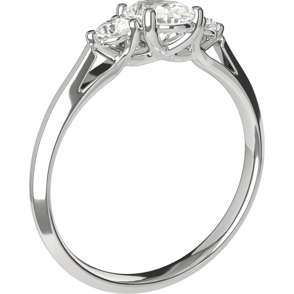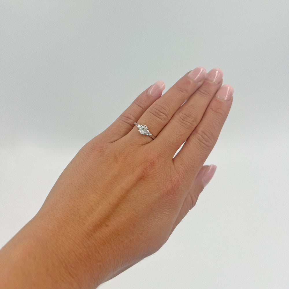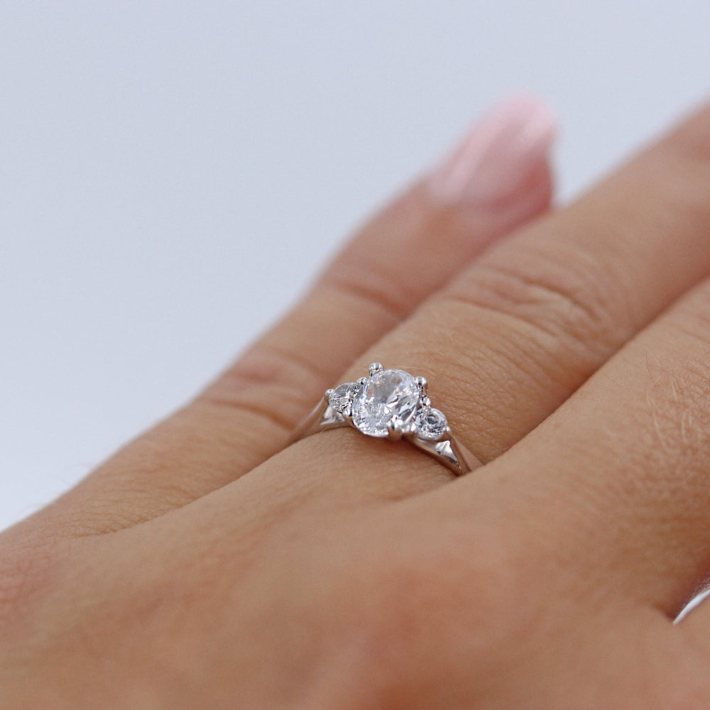 Eterna 20 is an elegant three-stone ring with an oval-cut diamond of 0.50 ct in the center, flanked by two brilliant-cut side stones of 0.07 ct each. The oval cut highlights the diamond's luster and gives a soft, elongated shape that creates a stylish yet eye-catching expression. A diamond ring that is just as beautiful as an engagement ring or a wedding ring.