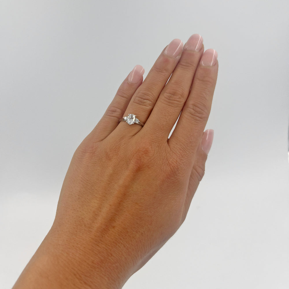 The Eterna 21 features a magnificent 0.70ct oval-cut diamond at the center, whose elongated shape creates an elegant silhouette and maximum light reflection. The two brilliant-cut side stones, each 0.07ct, enhance the sparkling clarity of the center stone and highlight the sophisticated design of the ring. The band is 2mm wide with a slightly curved inside, combining timeless elegance with high comfort.