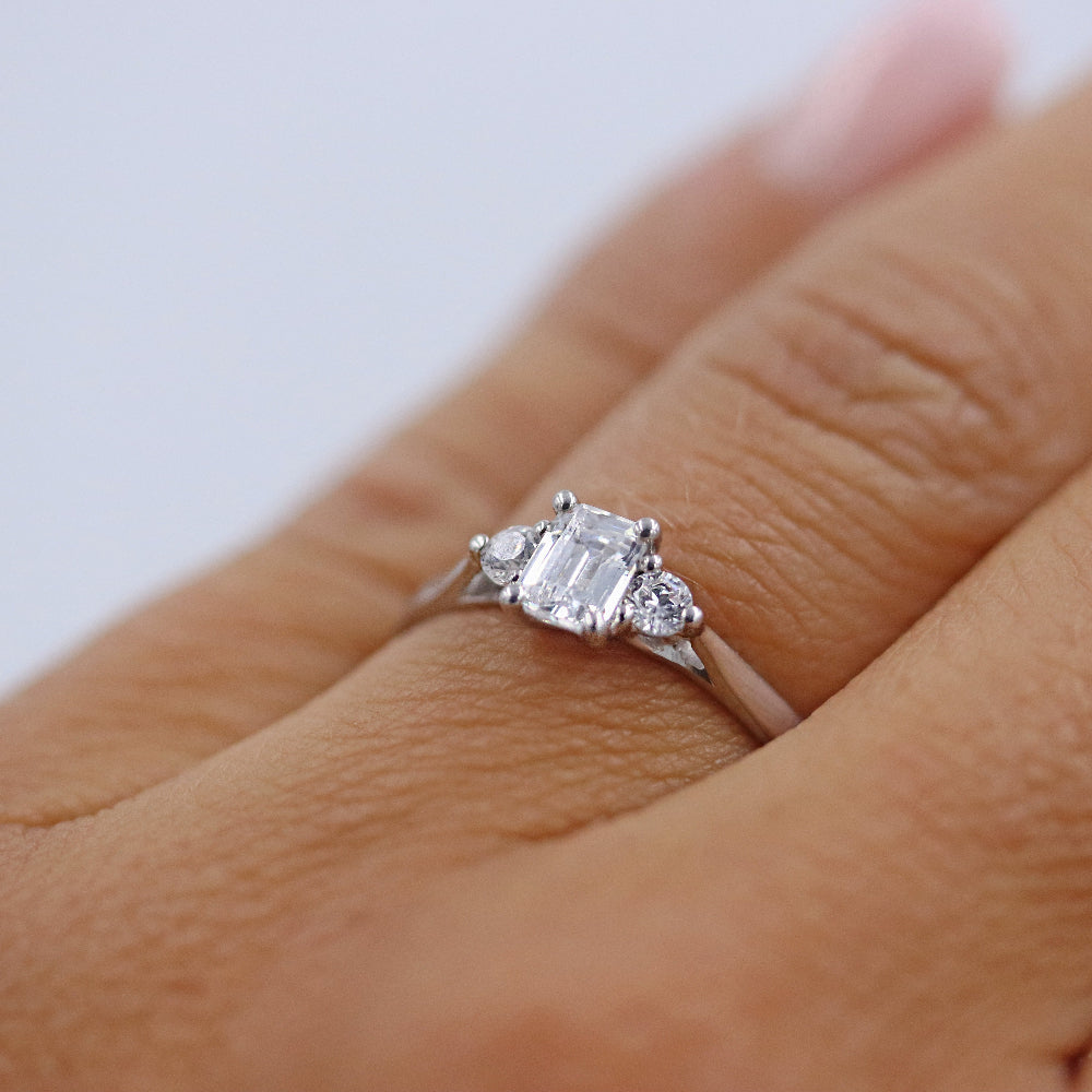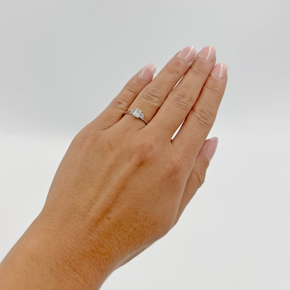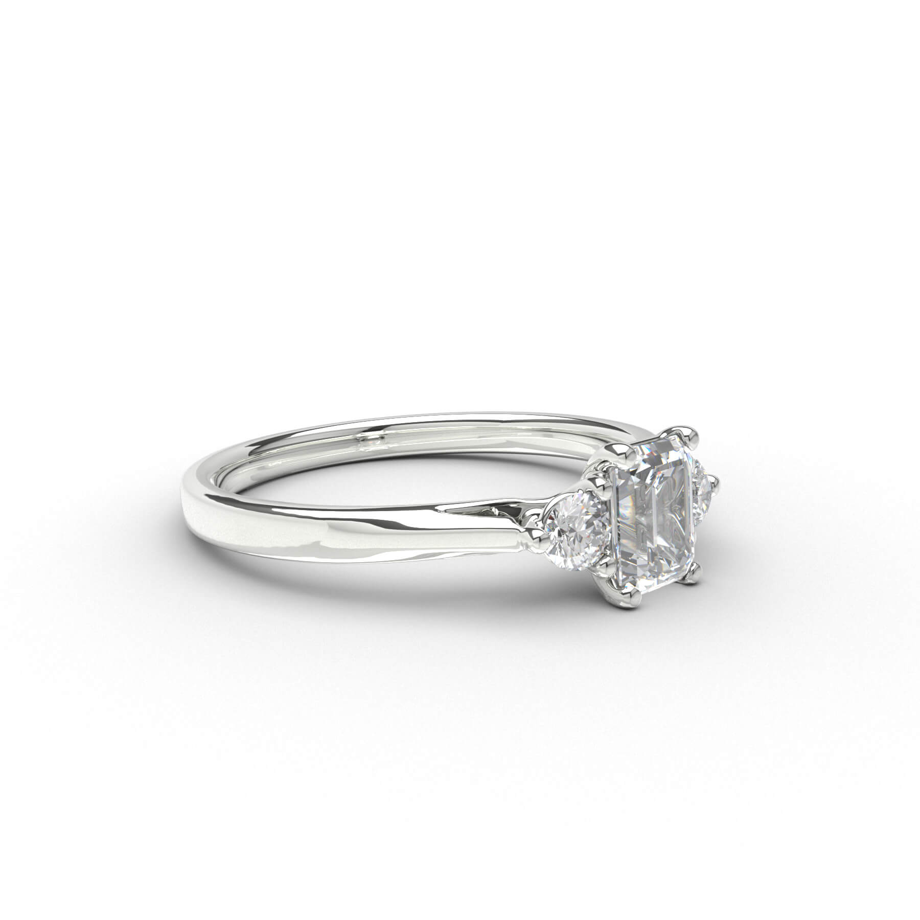 The center of the Eterna 23 is adorned with an emerald-cut diamond of 0.50 ct, together with two brilliant-cut side stones of 0.07 ct each, giving the Eterna 23 a total carat of 0.64 ct. The emerald-cut diamond has become increasingly popular thanks to its elegant expression, clean lines and reflective facets that give the ring a timeless and sophisticated luster.