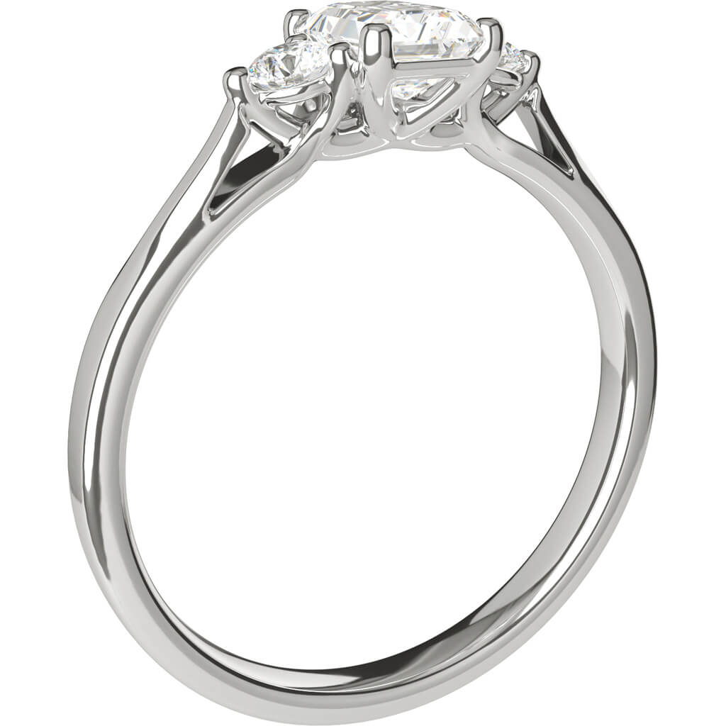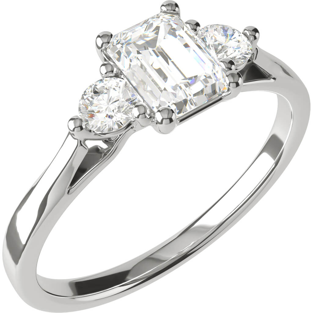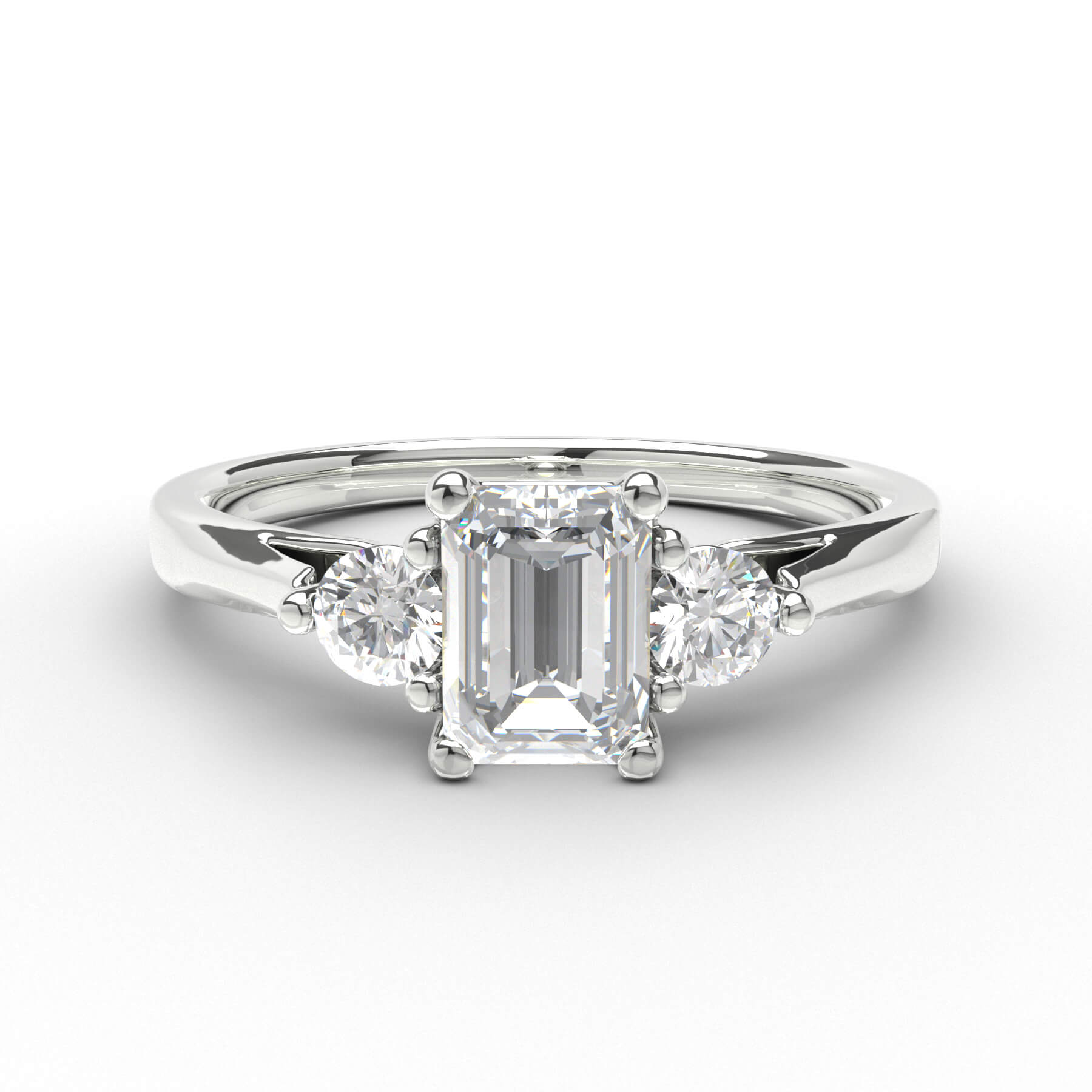 The center of the Eterna 23 is adorned with an emerald-cut diamond of 0.50 ct, together with two brilliant-cut side stones of 0.07 ct each, giving the Eterna 23 a total carat of 0.64 ct. The emerald-cut diamond has become increasingly popular thanks to its elegant expression, clean lines and reflective facets that give the ring a timeless and sophisticated luster.