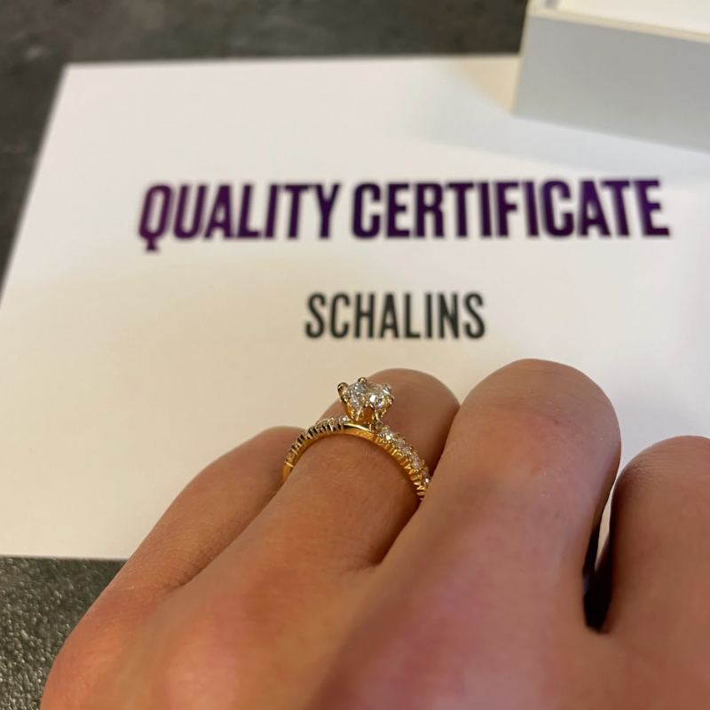 Your Schalins certificate is a document of value and, together with the carat engraving, it confirms that the ring is authentic and not a plagiarism.
