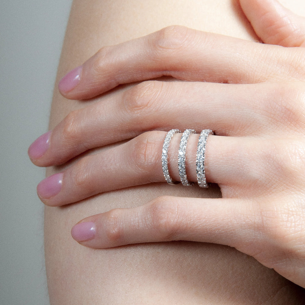 Eterna 11 is one of our Eterna wedding rings with the largest diamond size. With its softly rounded shank and meticulously hand-cut fishtale setting, each diamond – weighing 0.07 carats – is held in place, creating captivating radiance and brilliance.