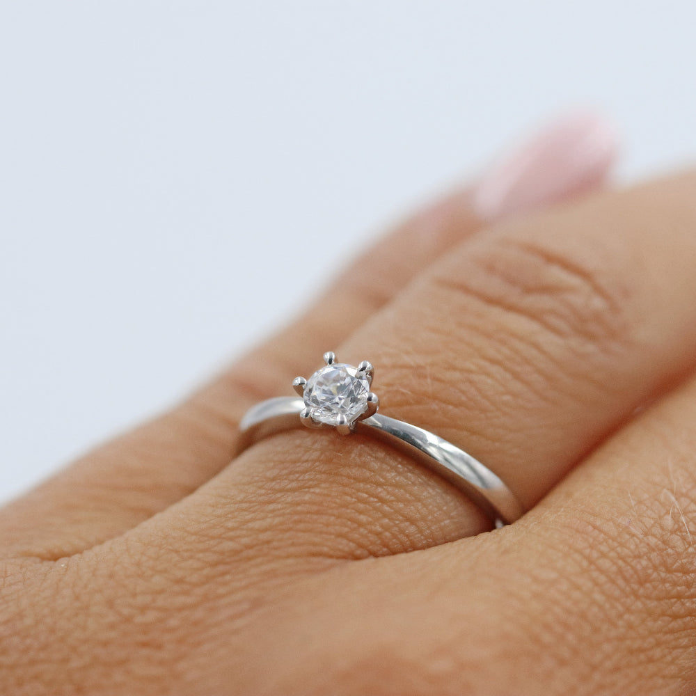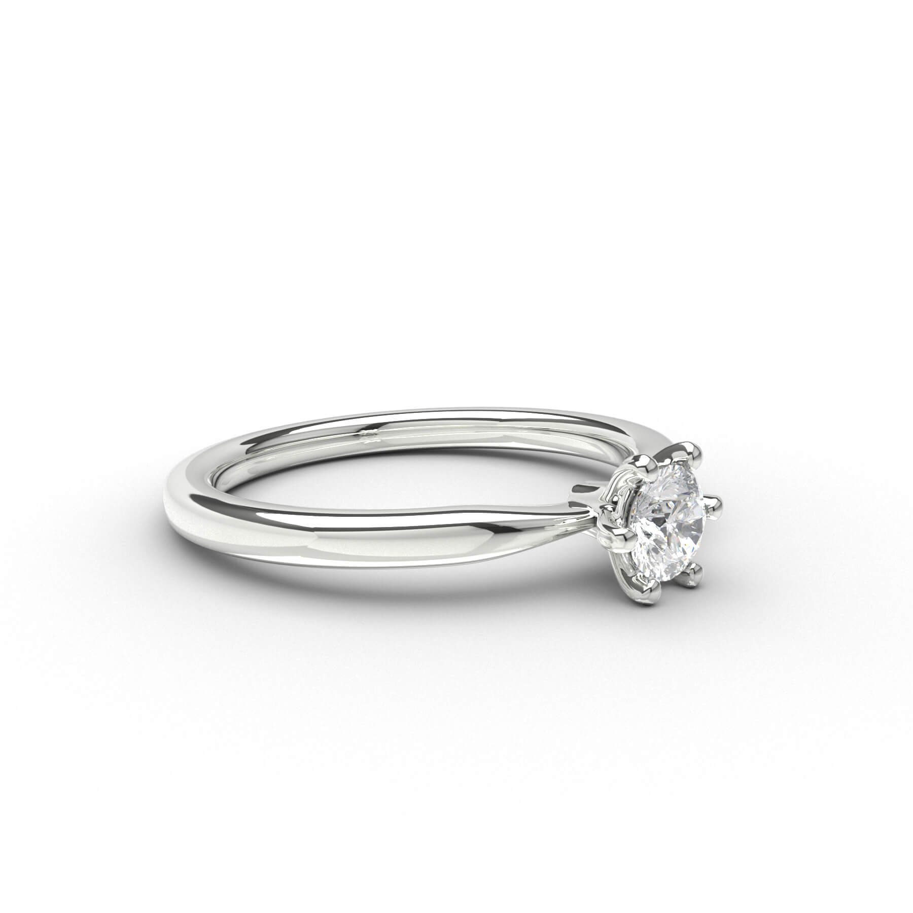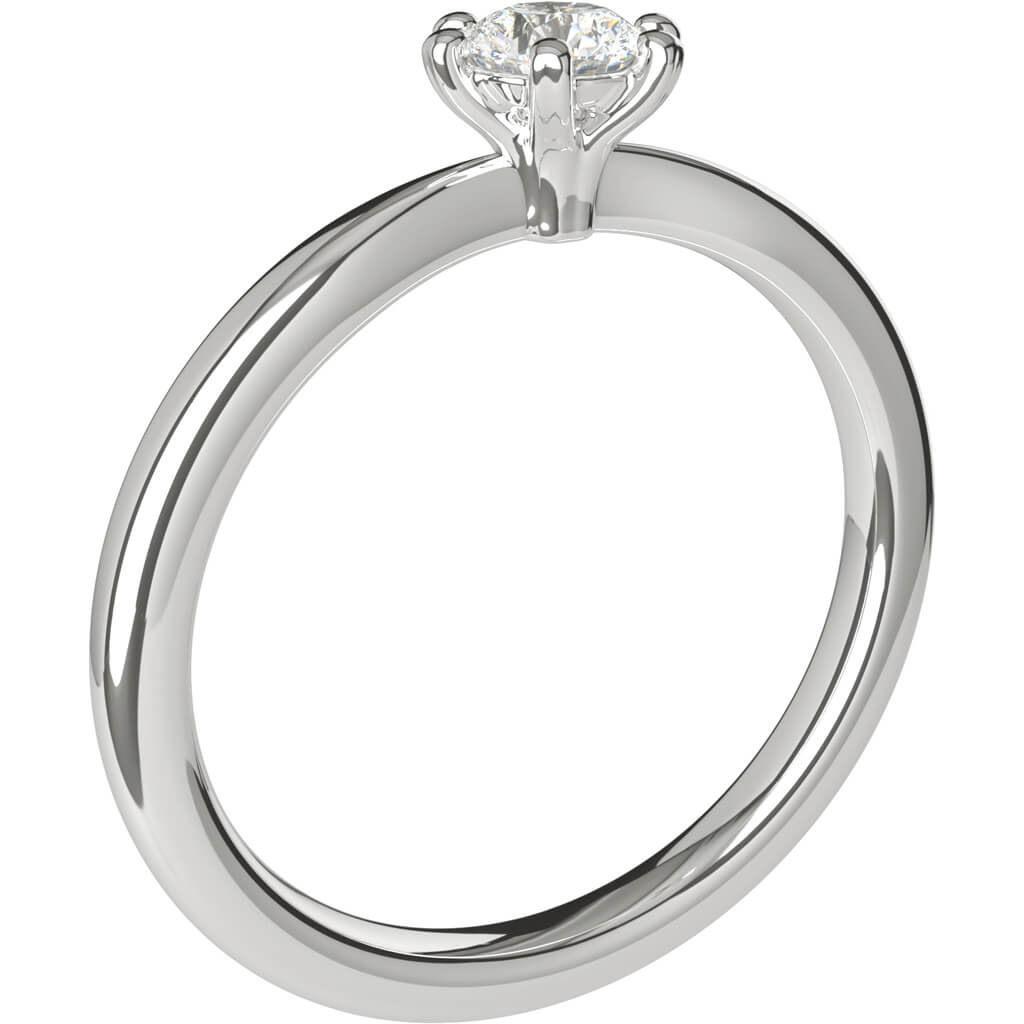 The ring's soft shape and tasteful waist draw attention to the beautiful diamond, which is securely encased by six claws while allowing its shimmering luster to shine freely.