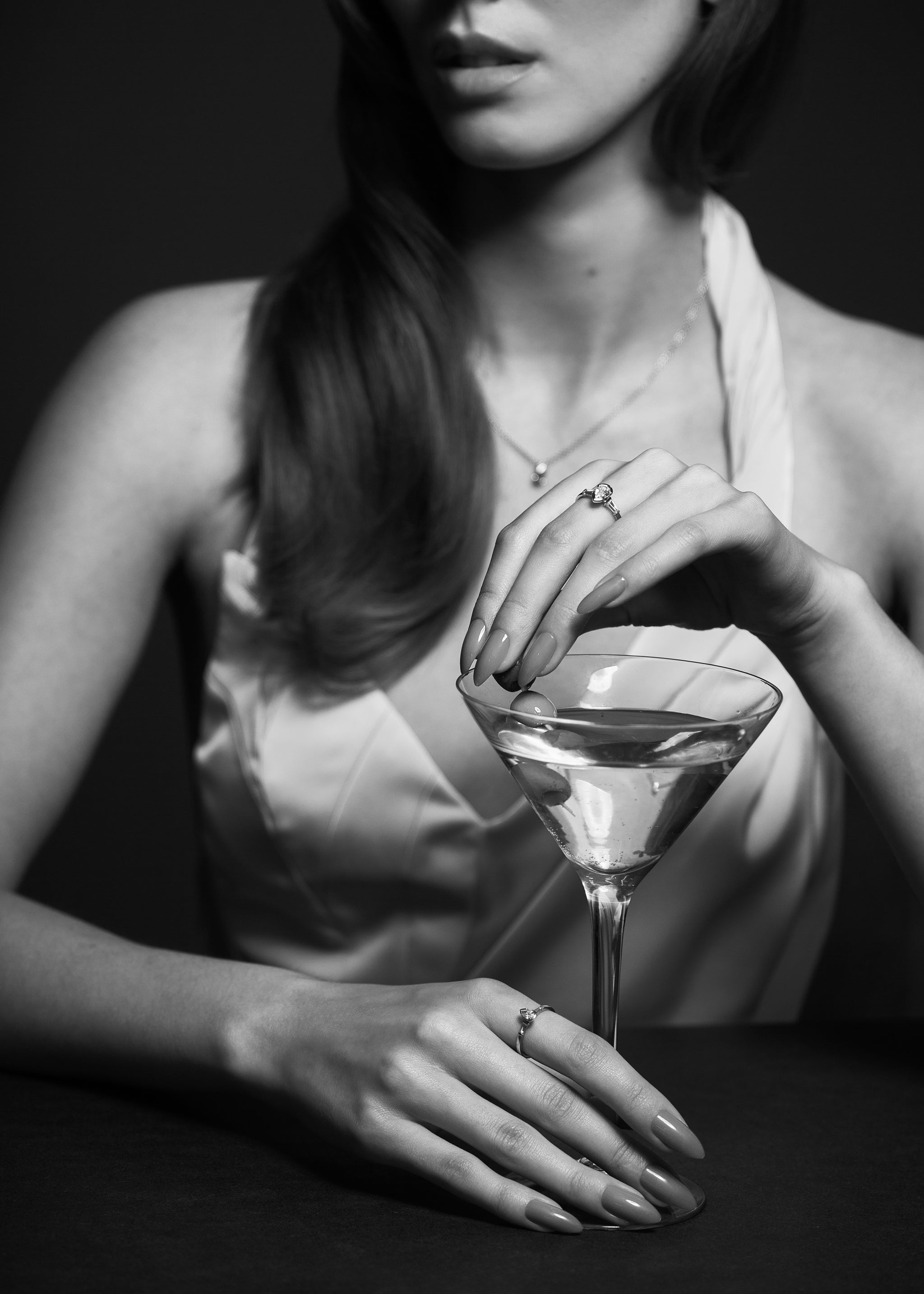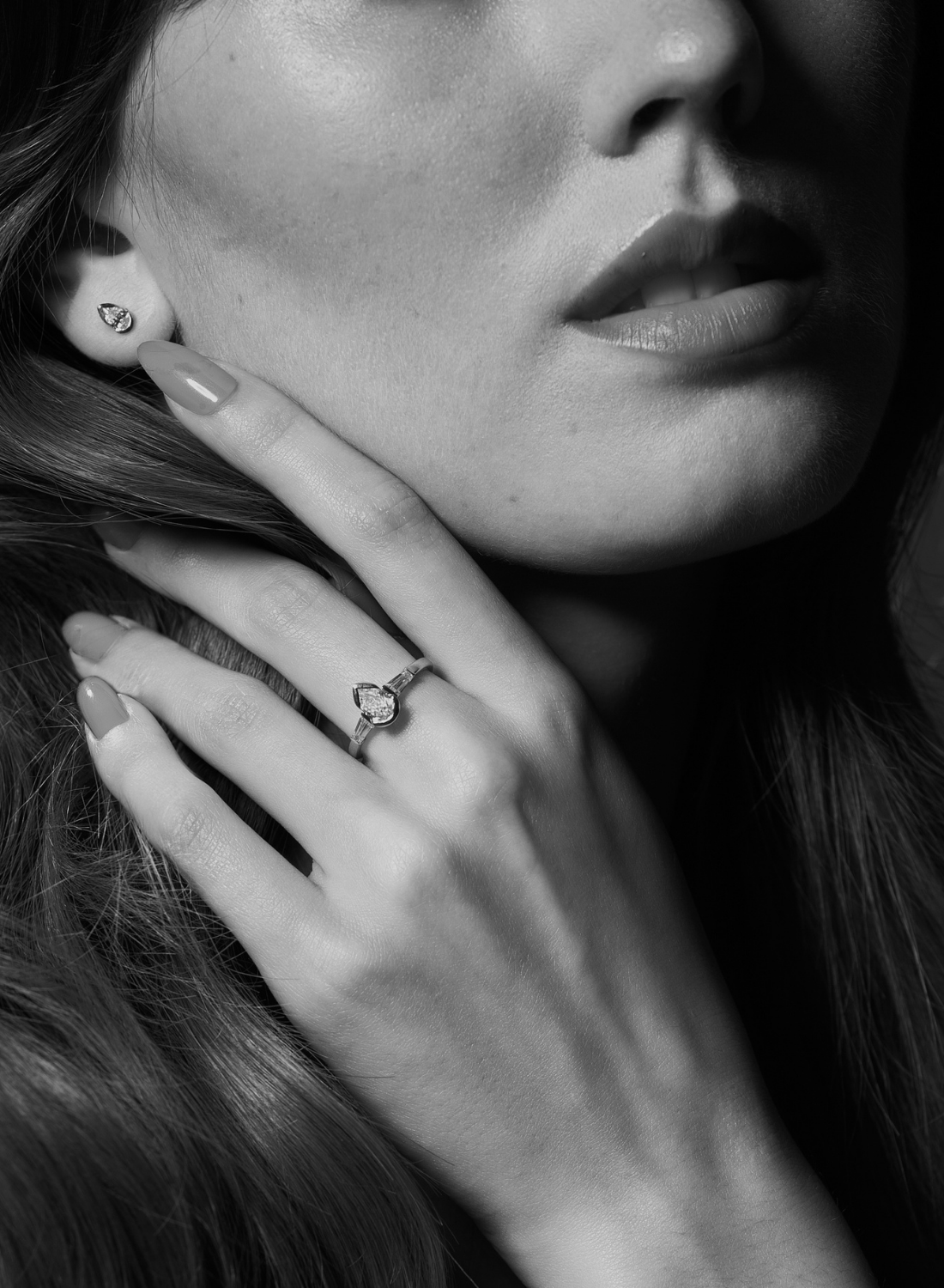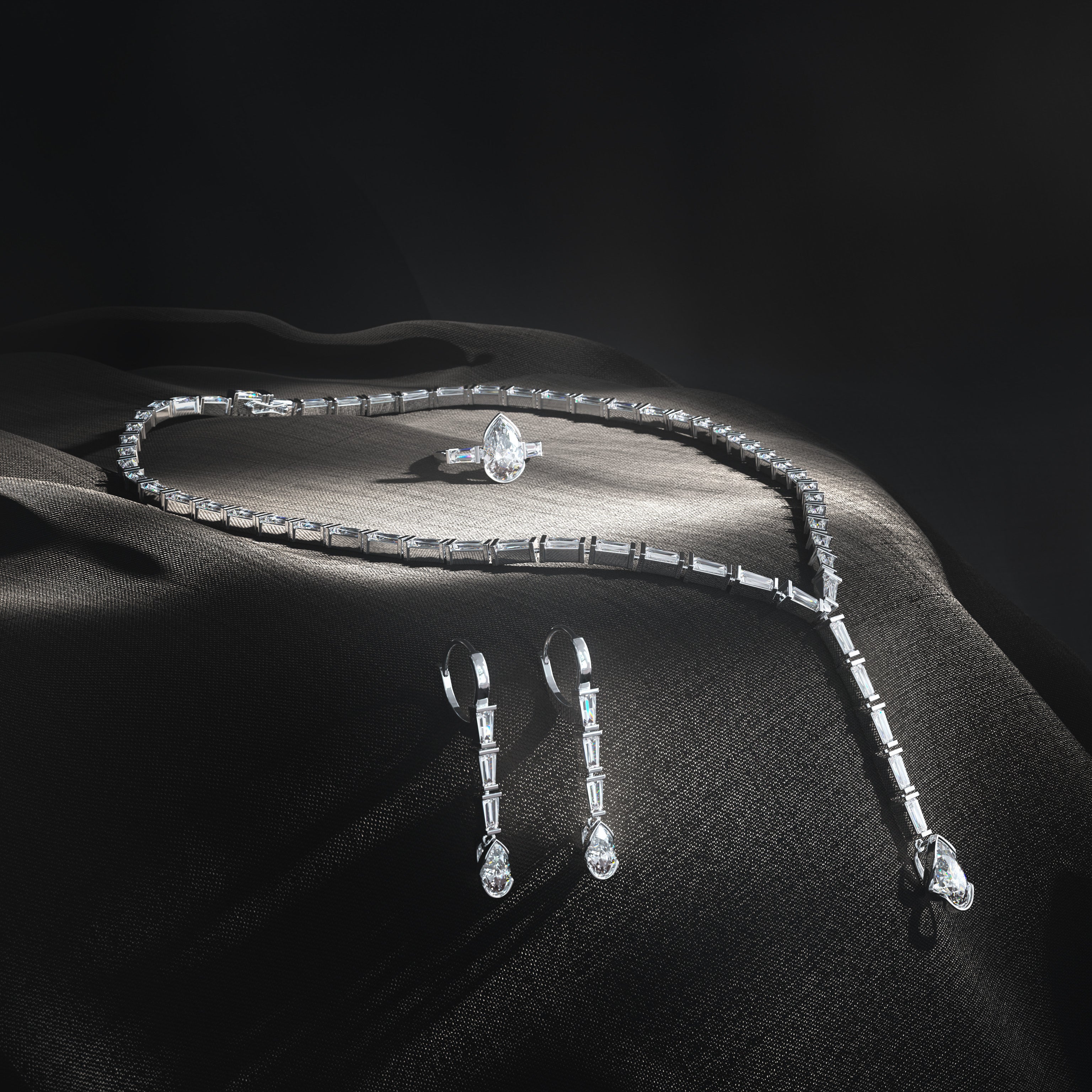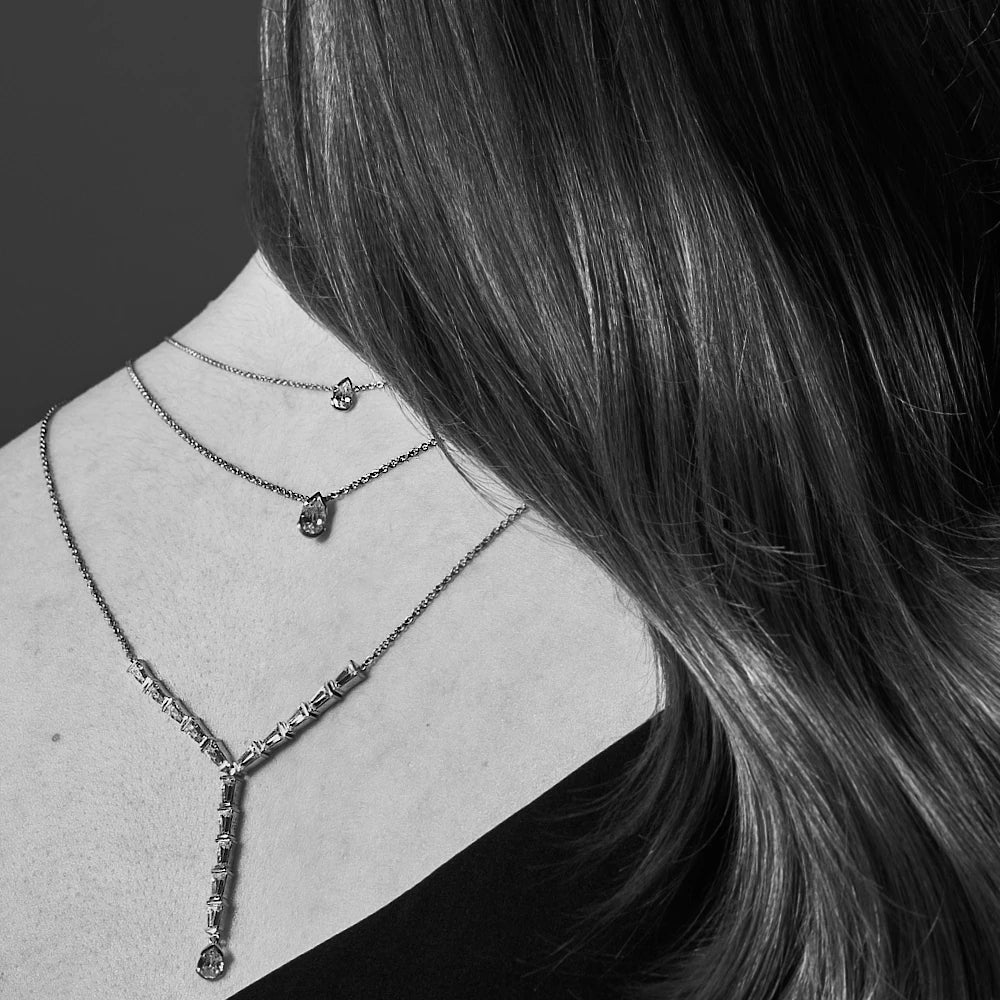 Diamanternas droppform, infattningen med halv bessel, det är inte så vanligt i Sverige. Halsbandet som var en utmaning konstruerat som tennisarmband. Alla kluriga detaljer och finjusteringar för en perfekt slutfinish som håller över tid.
