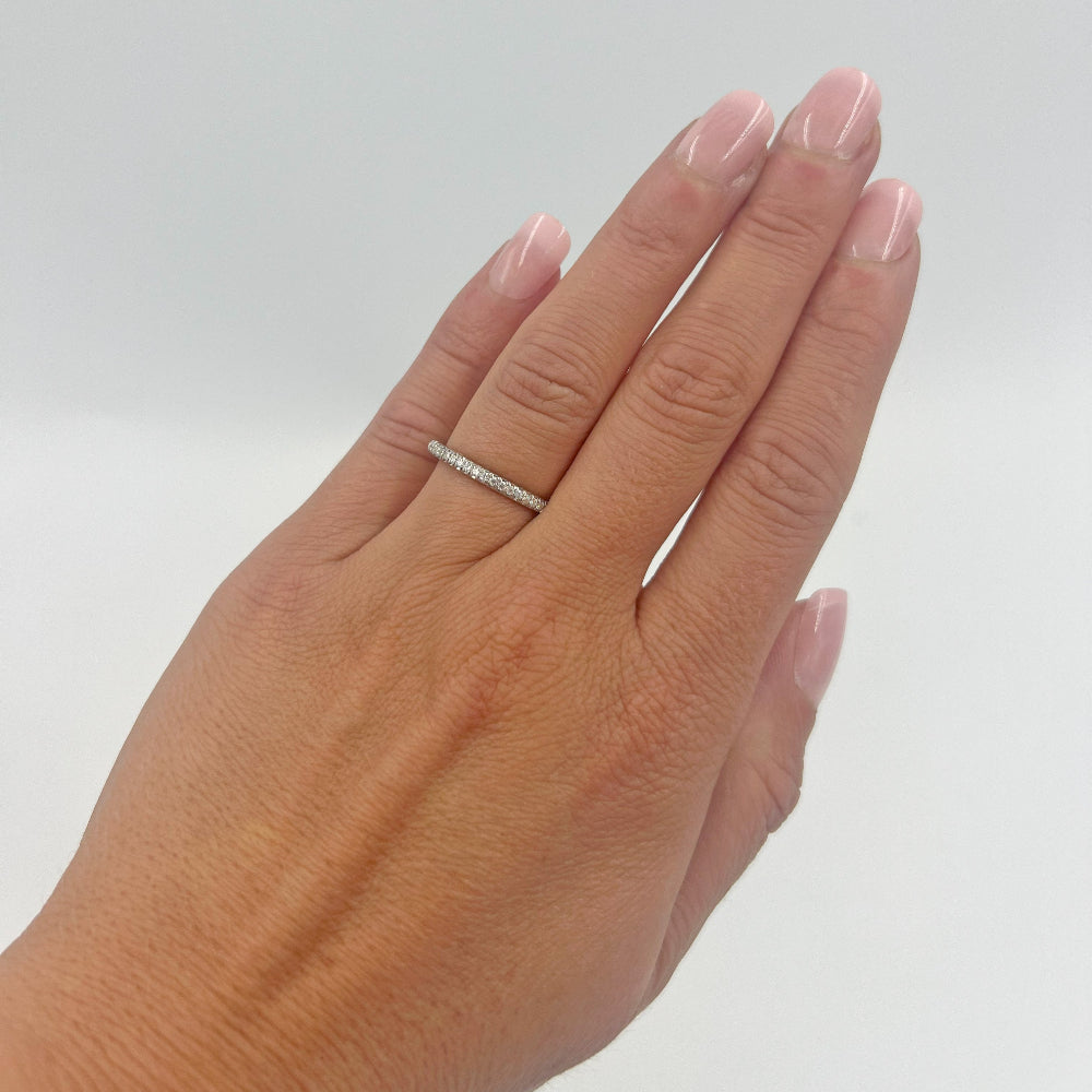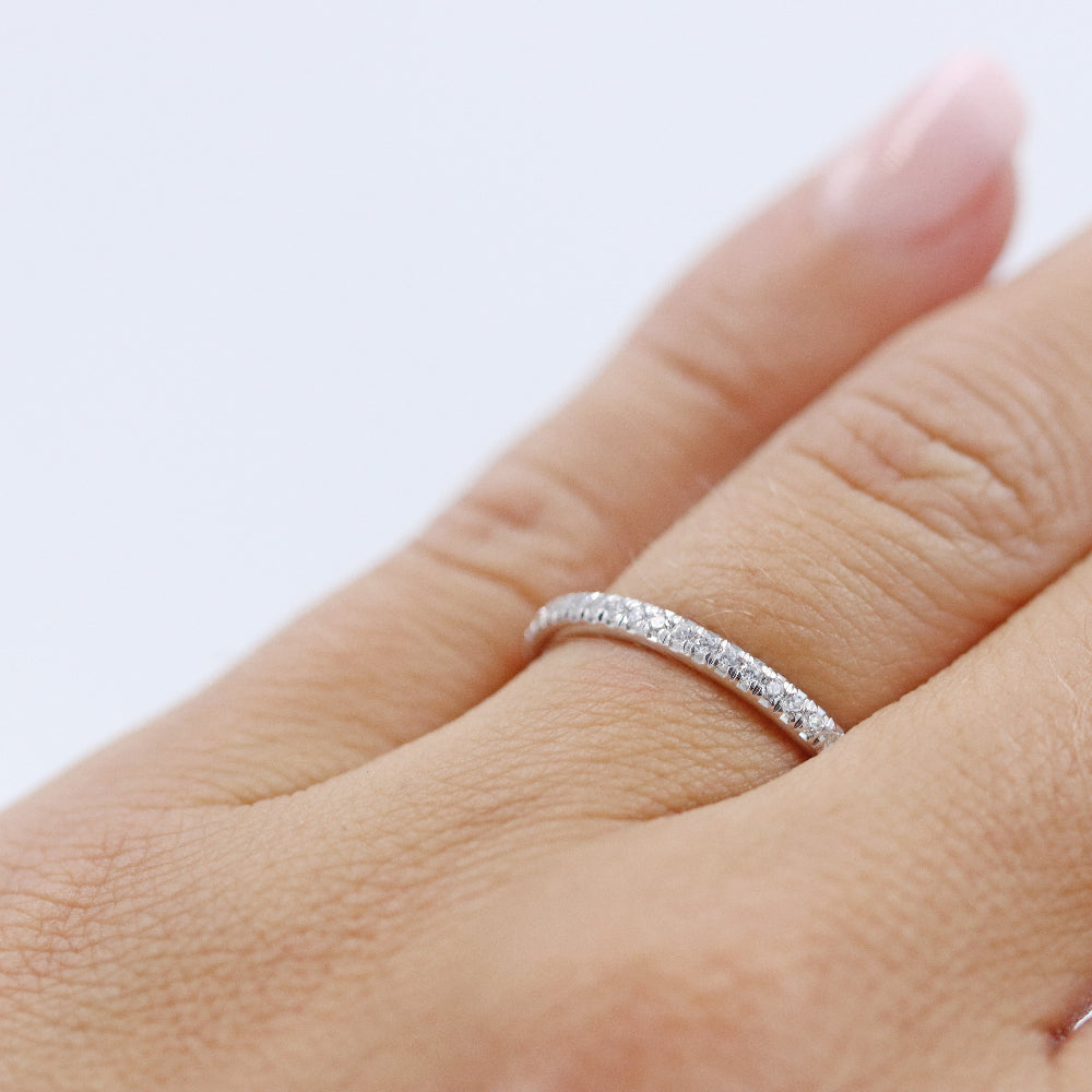 Aure allians 2 mm är en elegant alliansring med helrund skena som mäter 2 mm i både bredd och höjd. Ringen är infattad med 26 briljanta diamanter på 0,008 ct vardera i en klassisk krabbfattning, vilket ger ett tidlöst uttryck där stenarna får maximalt med lyster.