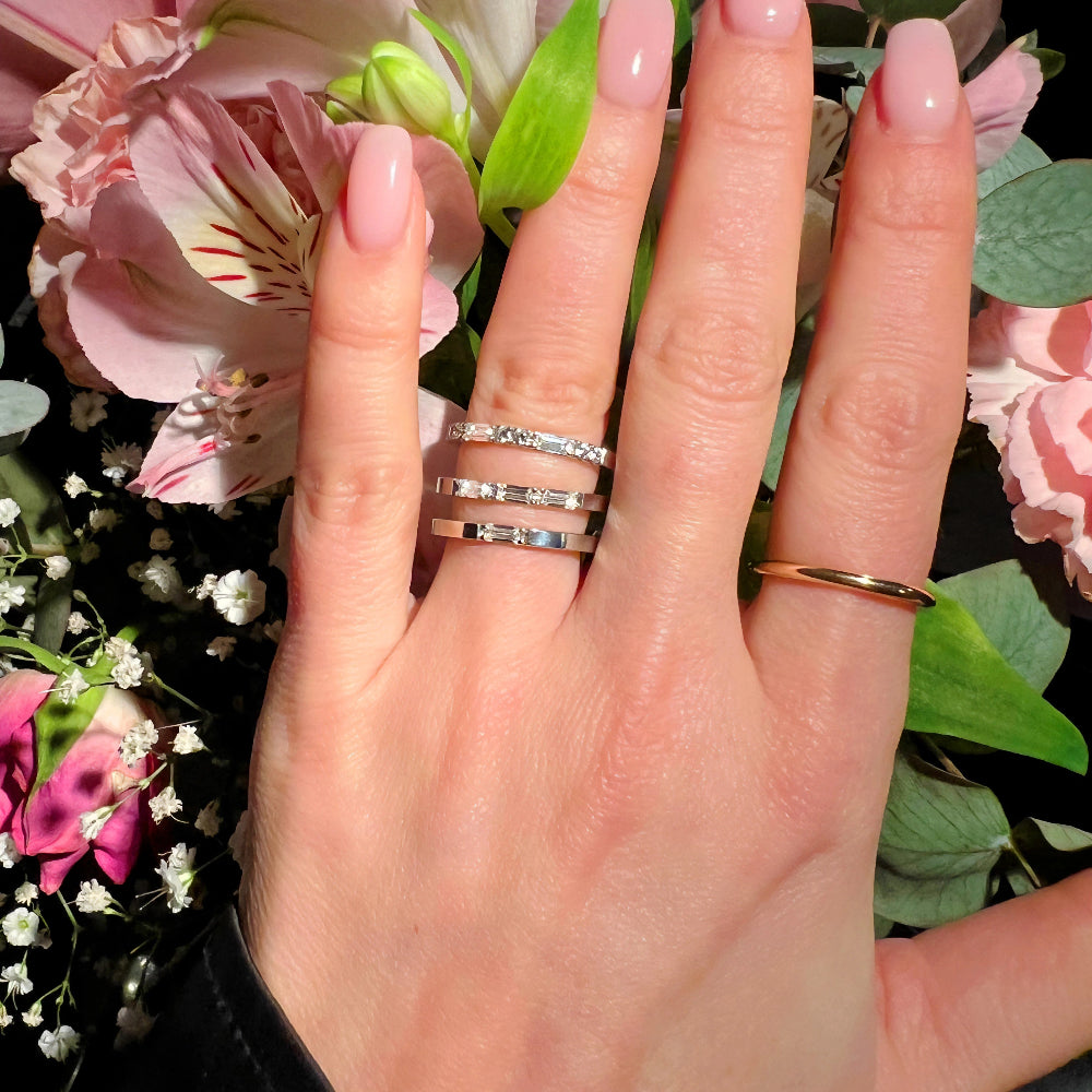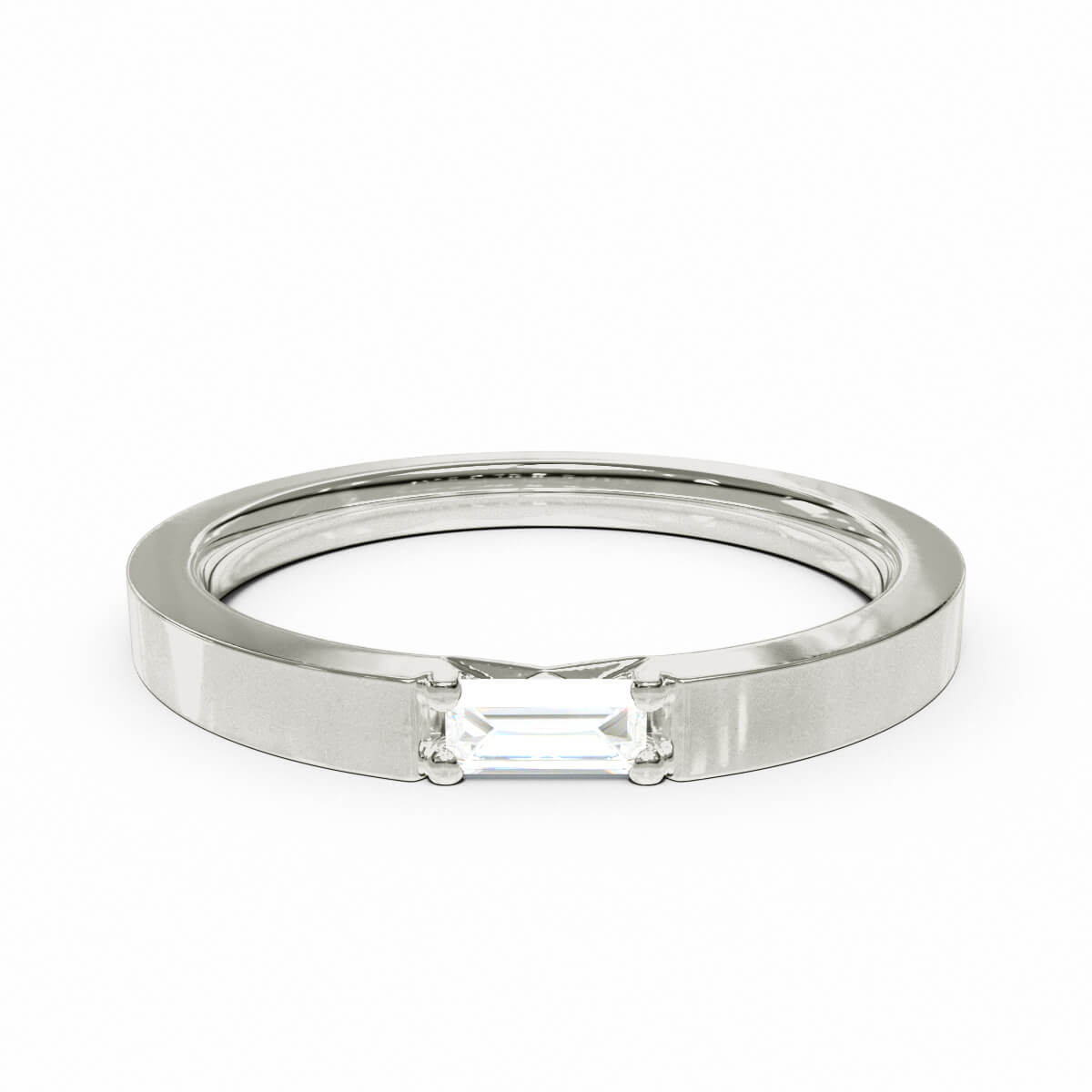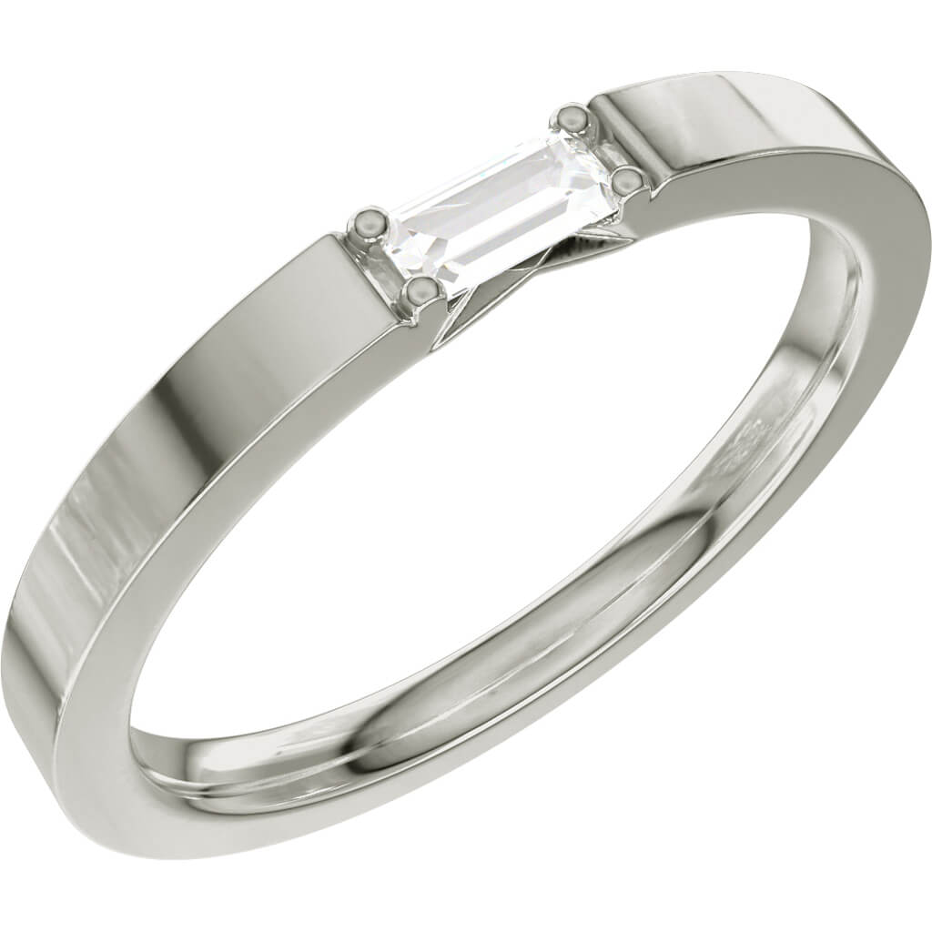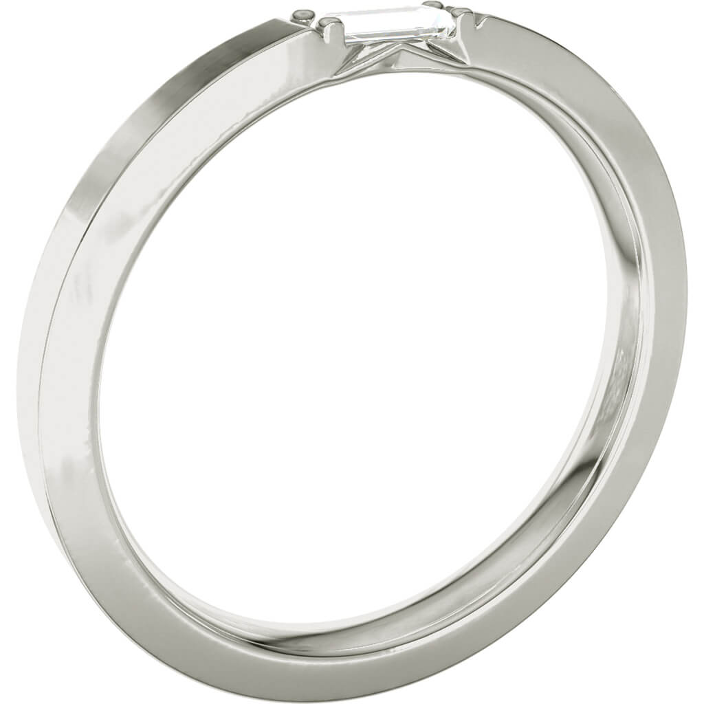 Med sin raka grundring sitter en baugetteslipad 0,10 carats diamant.  En diamant med karaktär infattad i en stilrent utförande perfekt för den som vill ha något unikt men ändå diskret. Eterna 13 har en harmonisk form som passar lika bra på en maskulin som feminin hand och blir ett utmärkt val både som förlovningsringar, vigselring eller smyckesring.
