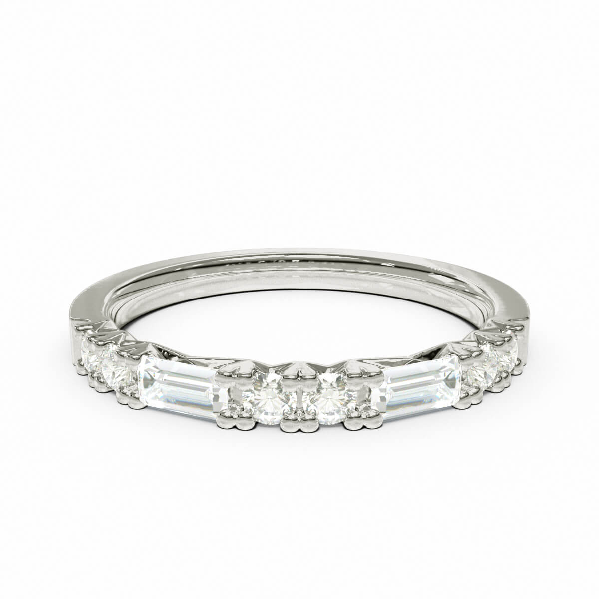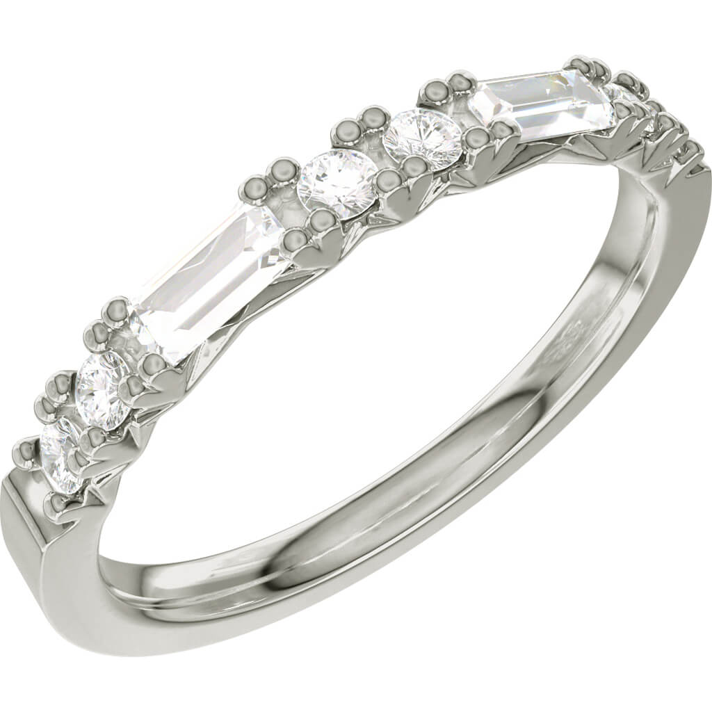 De två elegant baugetteslipade diamanterna på 0,10 carat vardera omfamnas på var sida av två briljantslipade diamanter, alla med TWVS-kvalité. Tillsammans bildar de totalt 0,38 carat. Tack vare diamanternas olika form och infattning, bildar de tillsammans en helhet av trendriktig design och speglar även en evig tidlöshet som gör ringen helt enastående.