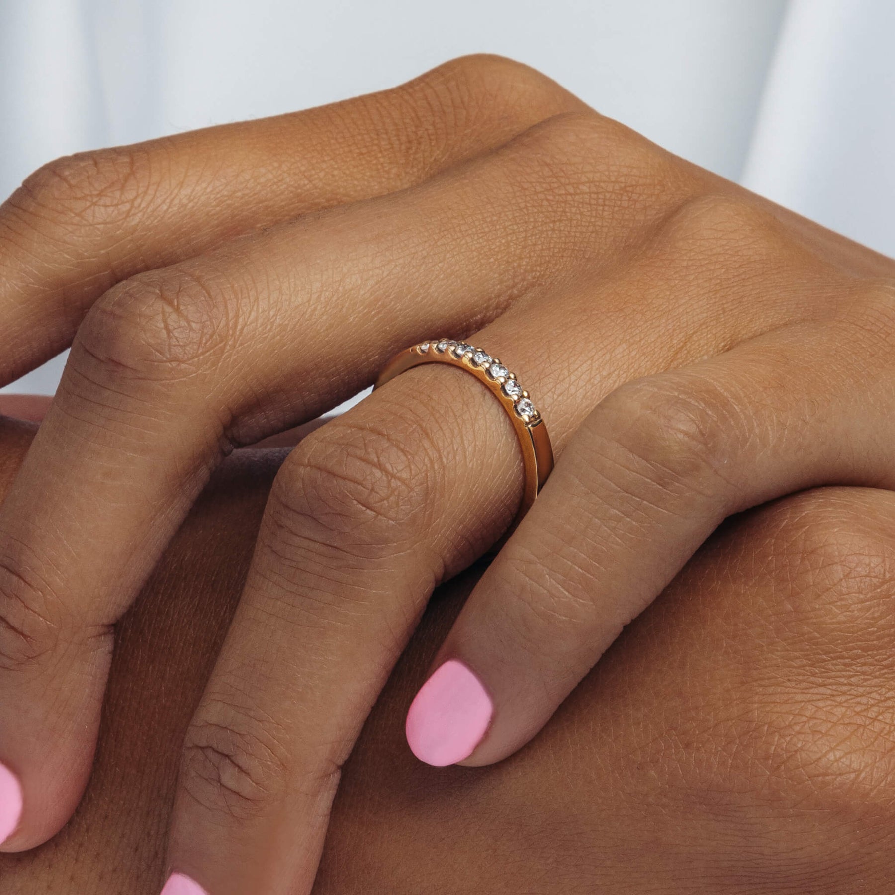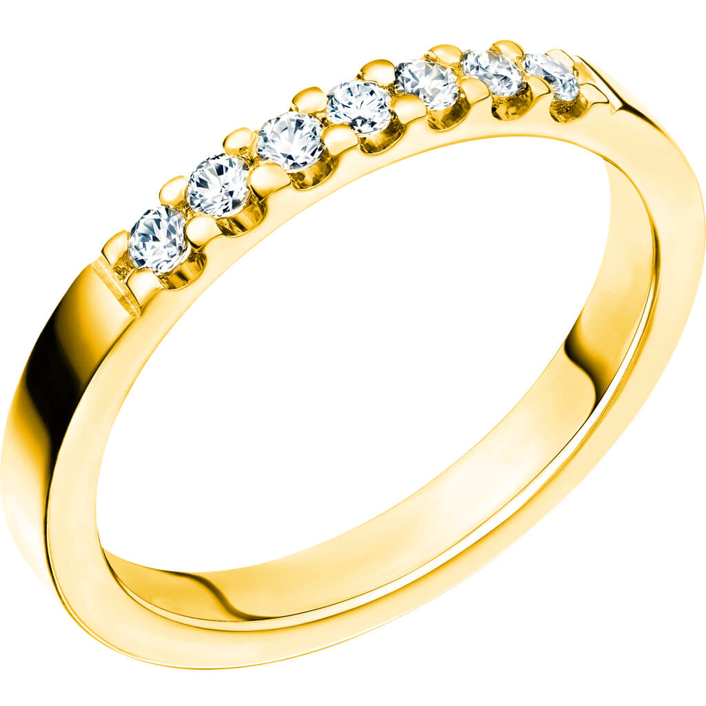 Med sju gnistrande diamanter får du totalt 0,21 carat att beundra i denna 2,5 mm nätta alliansring. Vill du att stenarna ska sträcka sig ännu längre över ringen? Se då Lycka 0,33 ct där du istället får elva diamanter som pryder din ringskena. Vill du istället gå åt andra hållet och få en ring med färre antal stenar i samma krabbfattning? Ta en titt på Lycka 0,09 ct. Oavsett mängden av diamanter så lovar vi att du inte kommer att bli besviken av att bära denna vackra design på ditt finger.