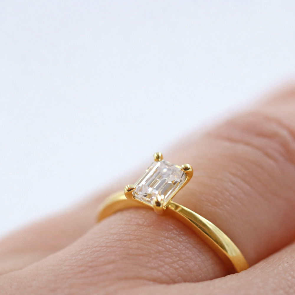 North Emerald cut är en förlovningsring med smaragdslipad lab grown diamant som kombinerar raka linjer med ett stilrent och sofistikerat uttryck. Den stora fasetten framhäver klarhet och kvalitet, och ringen passar lika bra som vigselring, solitärring, eller när du vill unna dig något elegant för dig själv.