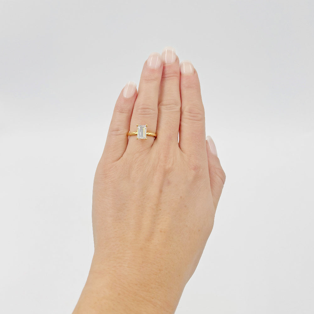 North Emerald cut är en förlovningsring med smaragdslipad lab grown diamant som kombinerar raka linjer med ett stilrent och sofistikerat uttryck. Den stora fasetten framhäver klarhet och kvalitet, och ringen passar lika bra som vigselring, solitärring, eller när du vill unna dig något elegant för dig själv.